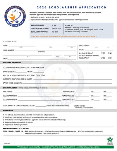 • Applicant lives in Wellington, Florida OR the applicant attends school in Wellington, Florida